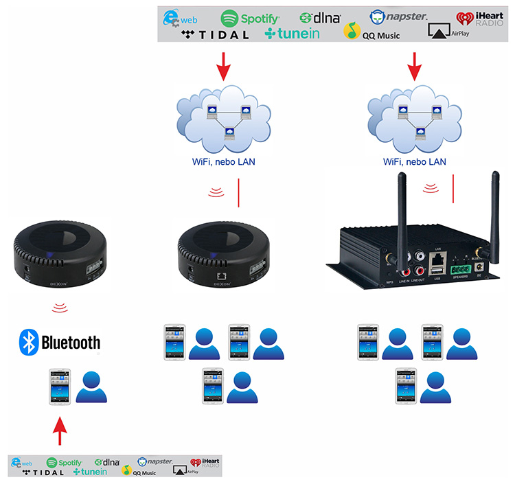Další možností, jak získat zdroj hudby pro saunu, je buzení rychlé kompaktní, bezdrátové, pomocí Bluetooth nebo WiFi na reproduktoru. Tentokrát na zdi nic nebude, není vidět žádná krabička se svíticím displejem. Vše je skryto. Jako budící zesilovač, tedy zdroj hudby, který je namontován vně sauny, kde je bezpečná teplota, zvolíme zesilovač JPM xxxx s Bluetooth, nebo WiFi, nebo LAN připojením. Hudbu streamujeme z aplikace ve smartphonu, tabletu, televizi, notebooku nebo stolním počítači. Čerpáte ji z internetu nebo ze svého domácího či cloudového úložiště.