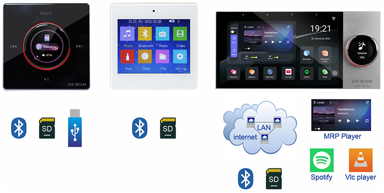 Mohli bychom vám doporučit připojení na stávající centrální audio systém v obývacím pokoji, ovšem je to nepraktické. Uživatelé chtějí mít ozvučení sauny obvykle oddělené. Existuje přelomová, do jisté míry, elegantní možnost ozvučení. Představte si, že vedle vypínačů na osvětlení instalujete další chytrou krabičku. Tou je tzv. nástěnný přehrávač se zesilovačem. Je to vlastně takové rádio pro saunu. Má v sobě přehrávač audia a videa, zesilovače, FM rádio nebo internetové rádio, většinou dotykový displej a hlavně spojení Bluetooth a na internet přes LAN kabel, nebo WiFi. Napájí se rovnou z 230 V a není potřeba žádný překážející adaptér. Předností nástěnných přehrávačů Dexon je jejich komfort a to, že v domácnosti nikde nic nepřekáží a hudba je vždy snadno dostupná, navíc i přes aplikaci v tabletu nebo smartphonu. Vše záleží na komfortu přehrávače, který si vyberete.